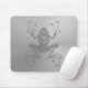 Um design tribal simétrico do sapo de árvore com redemoinhos e padrões de ponto intrincados. O design tem a aparência da gravação em um fundo de aço inoxidável