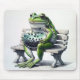 Um sapo verde feliz sentado em uma bancada de madeira observando girinos em um aquário