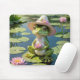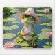 Um sapo vestindo uma palha enfeitada com flores senta-se sobre uma almofada de lírio com lírios de água cor-de-rosa e almofadas de lírio em volta do sapo em um lago de sereno