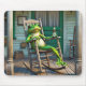 Um sapo relaxado sobre uma cadeira de balanço de madeira enquanto segurava uma garrafa de cerveja, colocada contra o pano de fundo de uma varanda russa