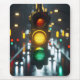 Uma luz amarela brilhante num semáforo suspenso sobre uma rua escura