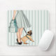 Senhora à moda com o filhote de cachorro bonito de passeio do pug dos sacos de compras elegantes no fundo stripy azul. Pintado pelo artista Maryline Cazenave.