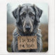 Um cão grande de casaco plano de cinza com olhos expressivos segura um cartolim de vazio com texto. O texto pode ser alterado ou excluído.