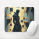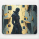 Uma fusão surreal de imagens sonoras e arte Kintsugi, mostrando quadrados abstrato e brilhando. Um sombreado. Uma figura sombria é destacada.