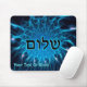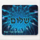 Texto escuro lendo "Shalom" (Hebraico: paz) sobreposto a uma imagem fractal azul mais clara. Adicione seu próprio texto adicional.
