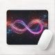 Altura dinâmica de um símbolo infinito néon brilhante num pano de fundo preto elegante, potencializado por faíscas cativantes