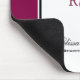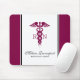 Mousepad personalizado com um símbolo na moda caduceus com as letras R N em ambos os lados. Uma borda roxa avermelhada com uma faixa preta em ambos os lados.