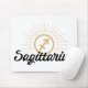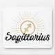 Zodiac design apresenta o símbolo de astrologia sagitário dourado, estrelado, com texto preto.