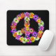 Um sinal de paz floral em tons de rosa, amarelo, laranja, roxo, verde, branco e preto.