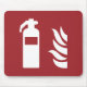 Extintor de incêndio e ícone de chama sobre fundo vermelho.