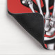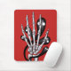 Mousepad manual do esqueleto com ilustração gráfica de uma mão de um esqueleto com fantasmas pretos e olhos brilhantes girando em torno dele sobre um fundo vermelho profundo e personalizável.