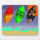 Um tapete do rato com uma imagem feita sob encomenda de três skimboards que pairam acima de um ajuste da praia.