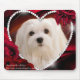 Uma imagem dramática de Snowdrop um maltês pequeno doce. As imagens consistem em um fundo de seda vermelho escuro sobre que senta um coração do diamante com uma fotografia de Snowdrop embellished por algumas rosas vermelhas bonitas.