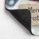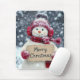 Um bonitão, vestindo algemas vermelhos, bonés e um cachecol correspondente, segura um cartaz que diz "Feliz Natal" em meio a um fundo de neve