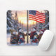 A family of snowmen stands proudly in front of a tall flagpole, with the American flag gently waving against a backdrop of snow-covered trees, as the sun casts a warm glow over the scene