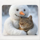 Um boneco de neve com nariz de cenoura segura um gato de mesa contente contra um pano de fundo de neve, onde o gato tem seus olhos fechados, aparentemente aproveitando a abraça