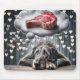 Um cão Wolfhound irlandês repousa a cabeça sobre uma mesa, sonhando com um bife suculento, como indicado por uma bolha de pensamento