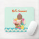 Um bloco de mouse com o texto (pode ser mudado para um nome ou algo assim) que diz: Olá Summer. Ilustrada com uma tigela de sorvete com 3 scoops deliciosos cobertos de aspersores de doces. Um cone de sorvete também com 3 colheres de chocolate, baunilha e morango. Uma tigela de sobremesa cheia de sorvete com sabor neopolita com uma cereja deliciosa no topo. Um padrão de cromo creme e azul ao longo da borda inferior.