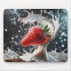 Um morango vívido e maduro espalha dinamicamente através do leite em espiral, criando uma mistura energética de movimento e cor