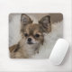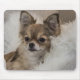 Um pequeno chihuahua pronto para ele está perto enquanto se reclama em uma almofada branca lisa.