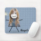Bonita figura de vareta em um vestido azul denim, cabelo, colar de pérolas, e óculos segurando um gatilho em um fundo de bolinhas. O texto pode ser editado.