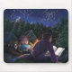 A arte Starry Night de Traci Van Wagoner impressão, posters, acessórios e presentes mostra nossa pintura original de duas crianças e seu grande e negro cão acampando sob as estrelas lendo um livro fantástico ao redor de um fogo no acampamento sobre cavaleiros e dragões. A magia da história está subindo no céu estrelado para mostrar um cavaleiro e um dragão numa dança eterna noturna de estrelas. Aproveite um acampamento noturno de verão nas montanhas.