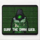 Uma figura misteriosa, encapuzada, ciberpunk olha para o espectador a partir de uma tela de computador.
