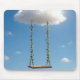 A whimsical swing adorned with colorful flowers and ivy hanging from a fluffy cloud against a vibrant blue sky, creating a scene of surreal charm