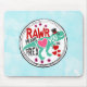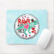 Mousepad com a imagem de um t-rex verde vestindo um chapéu preto com corações ao redor. O texto diz que Rawr quer dizer que te amo em t-rex.