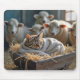 Um gato de mesa descansa confortavelmente envolto num cobertor dormindo num celeiro de madeira alimentado com feno e carneiros no fundo