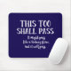 Quando os tempos são difíceis, é importante manter-se positivo e lembrar-se de que acabará por melhorar. Também é importante manter seu senso de humor. Este mouse pad engraçado diz, "Isto também vai passar. Pode passar como uma pedra no rim, mas vai passar." num texto branco a preto. Você pode mudar a cor de fundo azul se quiser.