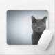 Tapete de rato com um gato cinzento visto de face e do espaço para inserir um texto sobre a esquerda