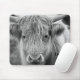 Um tapete do rato com uma imagem preto e branco de uma das vacas famosas das montanhas de Scotland.