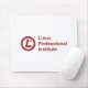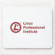 Tapete do rato com o texto do logotipo e do Linux Professional Institute do LPI no vermelho em um mousepad branco.