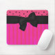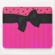 Tapete do rato cor-de-rosa e preto bonito feito nas listras e nas bolinhas, com uma fita e um arco pretos bonito grandes que vão através da largura do tapete do rato. Muito bonito para em casa ou no escritório.