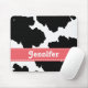Se você ama vacas do Holstein, você amará este tapete do rato preto e branco bonito, feito sob encomenda do impressão da vaca que pode ser personalizado com seu nome no design cor-de-rosa punchy da fita. © Chrissy H. Estúdio dos trabalhos de arte, LLC. Todos os direitos reservados.