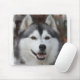 O cão de trenó do rouco Siberian fecha acima o tapete do rato.