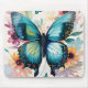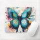 Mousepad apresenta trabalho de arte de natureza botânica de uma borboleta azul-lacrimogênea contra um fundo de flores coloridas. Um retrato de pintura de óleo de insetos florais.