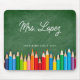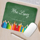 Um moderno mouse personalizado para professores com um fundo de quadro verde com lápis coloridos. Nome do professor em Script. Texto personalizado na parte inferior de uma fonte de serifa.