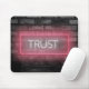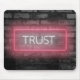 Sinal de néon cor-de-rosa TRUST brilhando na parede do tijolo preto com textura rústica