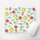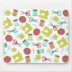 Um mousepad que caracteriza um design temático sewing que consiste em uma máquina de costura, em carretéis da linha, em um coxim do pino, em umas tesouras, em umas amostras de folha do tecido, e em agulhas sewing. O design tem um esquema de cores retro alaranjado, amarelo, vermelho, e do azul/turquesa.