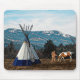 Uma imagem de um nativo americano e seu cavalo perto de uma tigela. A neve assentou nas encostas dos mais alto das montanhas ao fundo.