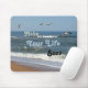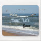 Linda cena de gaivotas voando sobre ondas de oceano azul-esverdeadas vagando gentilmente para uma praia primitiva com as palavras "Faça sua vida soar".