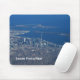 Foto do centro Toronto vindo do ar para uma aterrissagem num avião da Europa. Vocês podem ver a Torre CN, uma grande atração turística, Harborfront, e o lindo lago azul Ontário com as Ilhas Toronto.