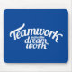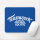 O trabalho em equipe faz o sonho funcionar com um mouse pad azul e branco. Mantenha sua equipe ou você focada no trabalho com essas mouses pads de citação motivacionais. Lê trabalho em equipe faz o sonho funcionar. A cor de fundo pode ser alterada para sua própria cor comercial, se necessário. Projetada por Sarah Trett para www.mylittleeden.com