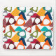 Este mouse pad tem um design moderno do século médio de triângulos dispersos, alguns com buracos, em cores retrorreflectoras.