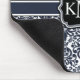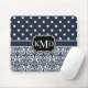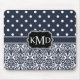Cor damasco de filigrana florescente e impressão de bolinhas em branco e azul marinho com trio personalizado de iniciais para o seu primeiro, último e médio nome. Bonita e elegante trendy girly três design de monograma. Legal presente para as meninas que querem um presente personalizado que apresente suas três cartas iniciais.