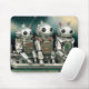 Três robots retro-futurísticos encantadores ficam lado a lado, apresentando corpos metálicos brilhantes, olhos expressivos e designs brancos. Sua aparência brincalhona é melhorada por vários dispositivos coloridos.