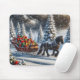 Uma paisagem nevada apresenta um cavalo puxando um trenó cheio de presentes coloridos através de uma floresta de árvores cobertas de neve