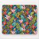 Tropical flowers and leaves in pink, blue, green, and many more colors combine to make a beautiful jungle print on this mouse pad.